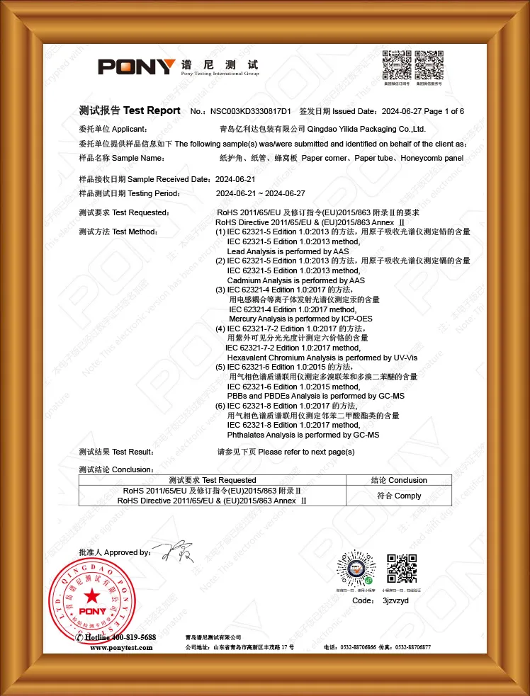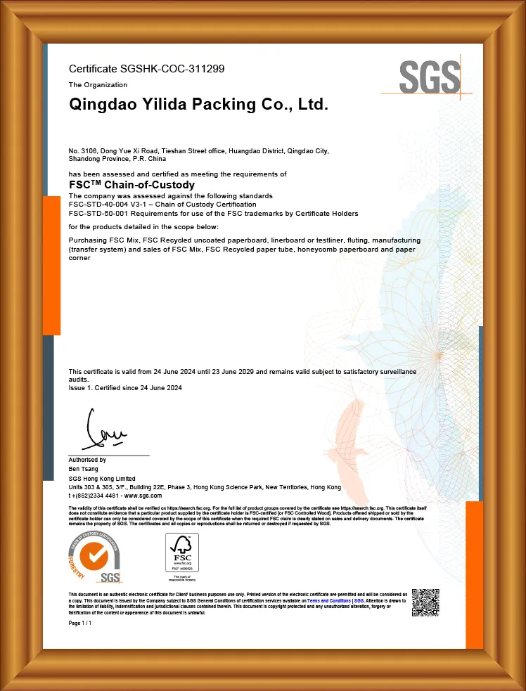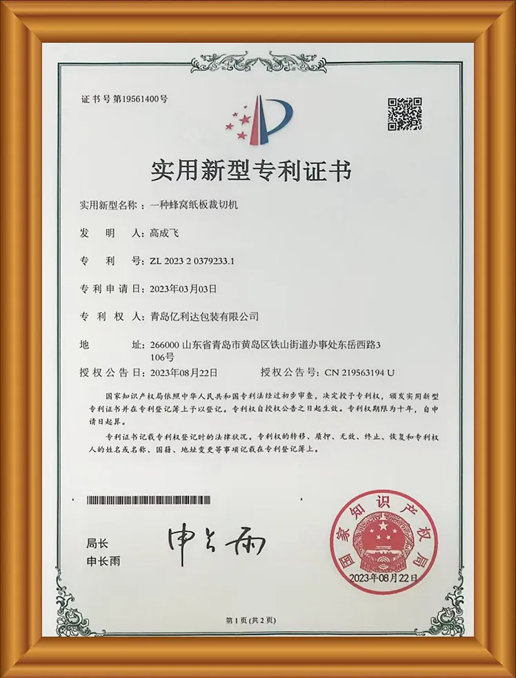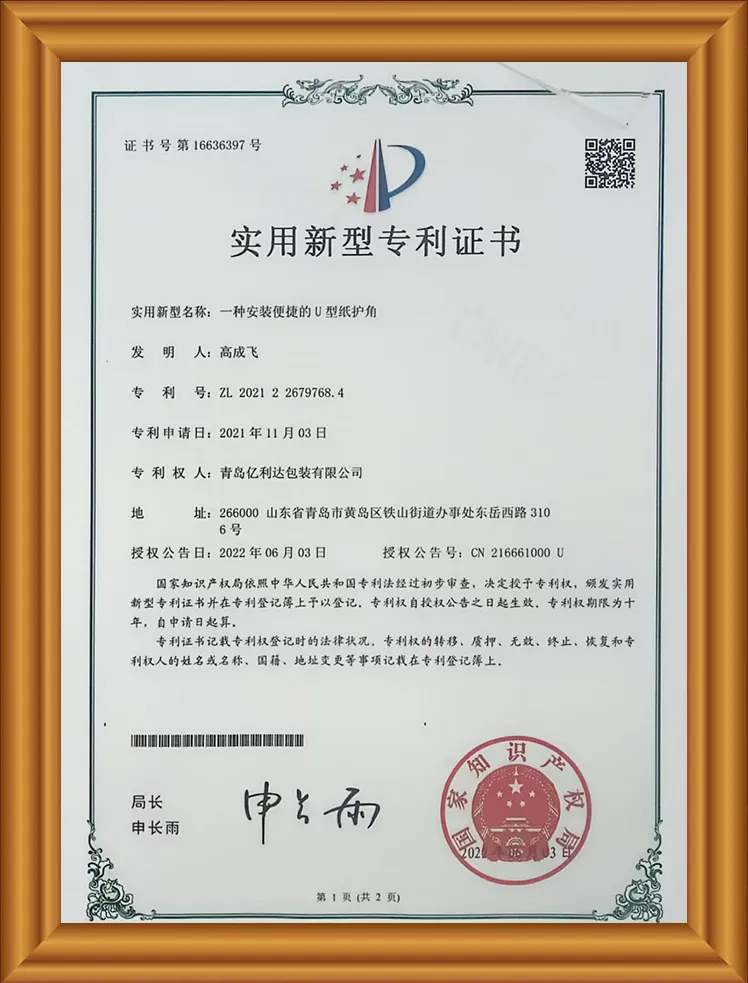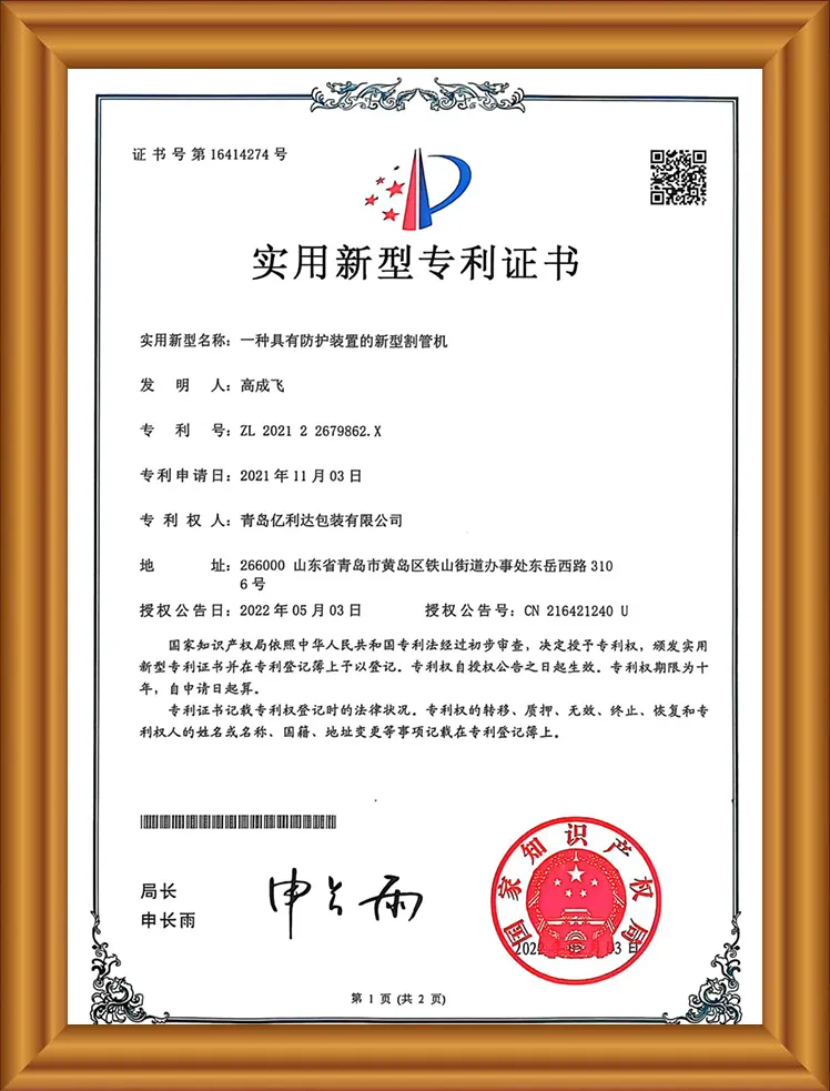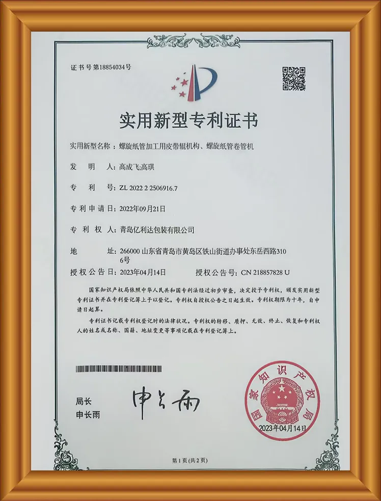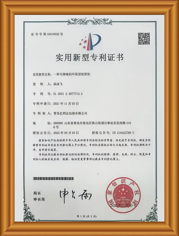 Tuotteemme ovat FSC-sertifioituja, ISO9001-sertifioituja, niillä on seitsemän patenttia, mukaan lukien kätevä U-muotoinen paperiputkikone, erikoistuneen ja innovatiivisen pienten ja keskisuurten yritysten sertifikaatti, Puni-testaus ja laatutoimittajasertifikaatti.